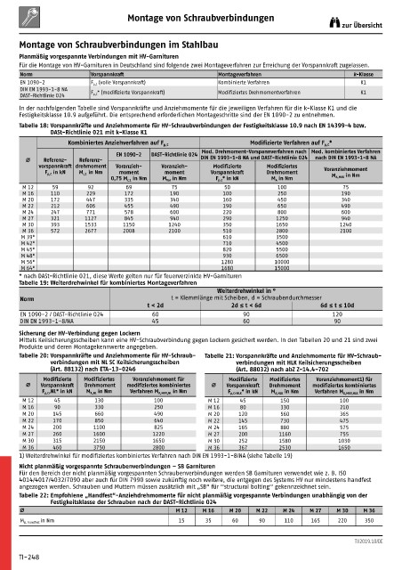 Tabelle 20: Vorspannkräfte und Anziehmomente für HV-Schraub- Tabelle 21: Vorspannkräfte und Anziehmomente für HV-Schraub-