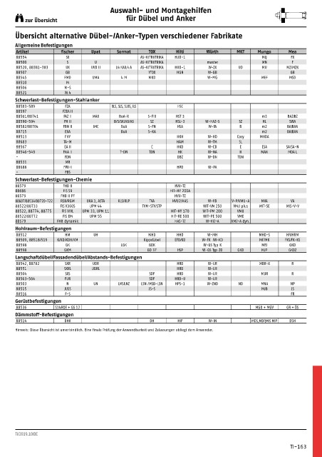 Übersicht alternative Dübel-/Anker-Typen verschiedener Fabrikate