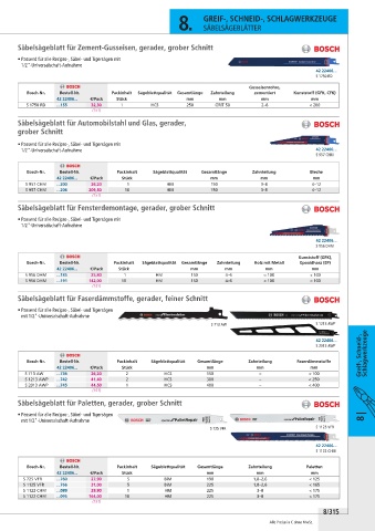 Bosch-Nr. Bestell-Nr. Packinhalt Sägeblattqualität Gesamtlänge Zahnteilung Faserdämmstoffe Greif-, Schneid-, Schlagwerkzeuge